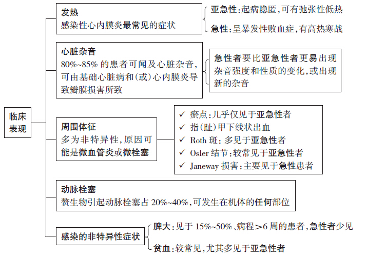 约1/3 患者有神经系统受累的表现:①脑栓塞占其中1/2,大脑中动脉及其分支最常受累;②脑细菌性动脉瘤;③脑出;④中毒性脑病;⑤脑脓肿;⑥化脓性脑膜炎 |