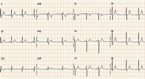 窦性心律;心率:60-100次/分; PR间期:0.12-0.20秒; QT间期:0.32-0.44秒; P波在I、II导联方向向上,在aVR导联方向向下; QRS时间:0.06-0.10秒; ST-T无异常偏移。
