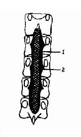 图2-16 胸髓碘油造影正位1.脊髓 2.神经鞘袖