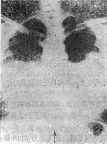 (一)中央型肺水肿 以两肺门为中心向两肺野扩展的阴影(可见支气管气影征),由深变淡,肺野边缘、肺尖和肺底清晰,呈“蝶翼状”分布,这是中央型肺水肿典型的X线表现(图114-1)。常见于心脏和尿毒症患者。治疗及时一般很快吸收消失(3天之内);如治疗不及时,肺泡内除渗液外,可以为凝固的纤维蛋白和巨噬细胞所充填。可产生炎性改变。肺水肿可继发感染。